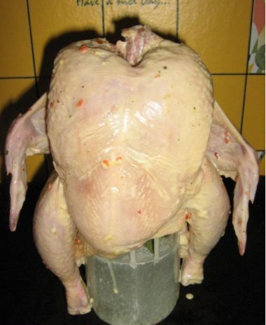 Как запечь курицу в духовке целиком на банке? Подготовьте все ингредиенты. Вкус блюда сильно зависит от того, какую курицу вы выберете. Я обычно запекаю курицу весом меньше 1,5 кг. Желательно покупать охлажденную, так как по замороженной тушке тяжело судить о свежести и качестве мяса. Курица должна быть светлого розового цвета, с нейтральным запахом. Если вы берете домашнюю птицу, она должна быть молодой (меньше года), иначе она не подойдет для запекания.