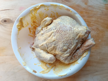На ужин приготовила курицу в духовке целиком на банке. Тушка у меня была весом около 1,5 кг. Сухой горчицы у меня не было, добавила немного готовой. Из специй использовала только соль и молотый черный перец. Мариновалась курица около 40 минут.