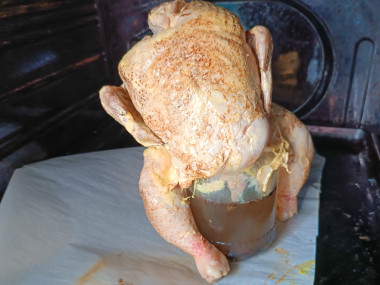 Заполните его наполовину холодной водой. Ставьте запекаться курочку в холодную духовку, чтобы вода равномерно нагревалась и бутылка не лопнула. Включите духовку до 200 градусов. Через полчаса уменьшите до 180 и запекайте в течение 1,5 часов. На протяжении этого времени обливайте курочку водой из противня, чтобы она не пересохла. Если видите, что она неравномерно запекается, более темные части можно прикрыть фольгой.