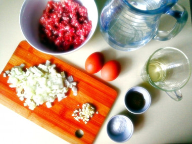 Как сделать шницель из фарша на сковороде? Подготовьте все необходимые ингредиенты. Фарш желательно брать из свинины и говядины в равных пропорциях. Если взять только из свинины получится жирновато. А если использовать только говядину, то шницель получатся очень сухим и жестким. Если же у вас в наличие есть только говядина, обязательно добавьте к ней сало, для сочности и мягкости.
