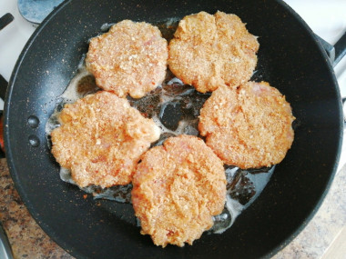 Фарш в холодильнике стал плотнее, проще в работе. Сформировав из него пять небольших шницелей (сделала их не очень тонкими, где-то по 0,4 см), аккуратно обмакивала каждый в льезон, панировала в сухарях, а затем выкладывала на разогретую сковородку с маслом. Жарила шницели из фарша на сковороде по 4-5 минут с каждой стороны до хрустящей корочки.