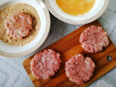 Готовила шницели из свиного фарша, в который добавила только соль и приправу для мяса. Отбила фарш хорошенько и убрала в холодильник, а сама занялась приготовлением льезона, для чего взбила вилкой два небольших яйца и добавила немного соли.