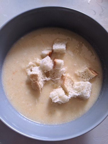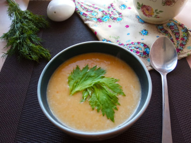 Приготовила сырный суп- пюре с плавленым сыром и курицей. Кусок курицы у меня был на косточке, поэтому бульон варила немного дольше, чтобы мясо легко отделялось от кости. При обжарке моркови с луком добавила стебель сельдерея ( нравится его аромат). В остальном от рецепта не отступала. Очень вкусный, нежный, ароматный суп получился. Спасибо, Юлия!