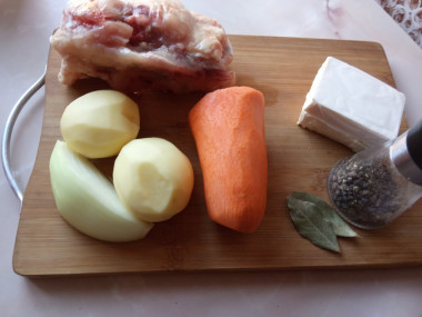 Калорийность продуктов: Картошка, Морковь, Плавленый сыр, Лавровый лист, Растительное масло, Перец горошком, Соль, Вода, Лук репчатый, Куриное филе, Душистый перец