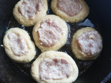 На сковороду налейте растительное масло для жарки и разогрейте его на среднем огне. На раскаленную сковороду выложите по одной столовой ложке картофельного теста. Сверху положите по одной чайной ложке с горкой мясного фарша. Распределите фарш тонким слоем.