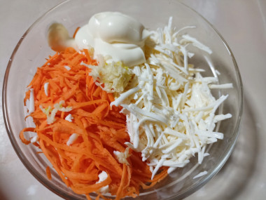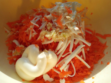 В подходящую емкость переложите натертые морковь, плавленый сырок, измельченный чеснок. Добавьте пару столовых ложек майонеза. Майонез лучше приготовить самостоятельно, будет полезнее и вкуснее. Заменить его можно сметаной или натуральным густым йогуртом и блюдо получится менее калорийным. Посолите по вкусу. Количество соли будет зависеть от того, чем вы решили заправить салат. Если сметаной или йогуртом то соли потребуется больше.