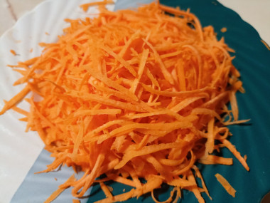 Морковь хорошо помойте под проточной водой. Очистите с помощью овощечистки. Если морковка молоденькая, чистить ее не обязательно, главное тщательно помойте ее жесткой щеточкой. Я натерла морковку на терке по-корейски. Вы можете натереть на крупной или среднего размера терке. Это не принципиально.