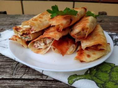 Очень вкусная закуска! Самое главное — выбрать вкусный лаваш, чтобы он был не резиновый, а тонкий и хрустящий. В начинку я бы еще добавила какие-нибудь овощи.