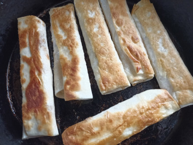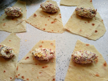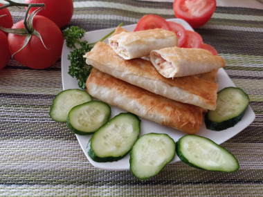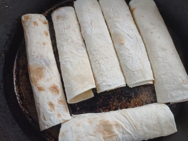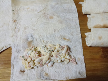 Заверните лаваш трубочкой. Края я не заворачивала, чтобы не было слишком толстых кусков теста.