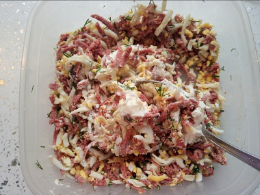 Размешайте продукты для начинки. Получится что-то типа салата.