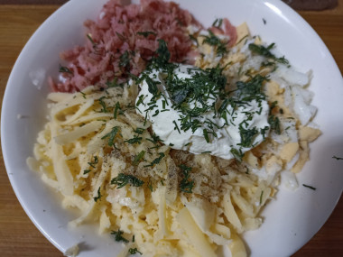 Возьмите большую миску, сложите в нее все нарезанные продукты. Добавьте немного соли и молотого черного перца. Учитывайте, что в начинке будет соленый сыр и колбаса, не пересолите. Положите сметану. Жирность может быть любая, это не принципиально. Вместо сметаны можно использовать майонез, тогда точно соли не понадобится. Но и калорийность блюда увеличится.