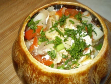 Теперь выложите в горшочек слоями: слой картофеля с морковью, слой зажарки и нарезанные грибы. Все залейте водой и поставьте в духовку почти на час. Готовое блюдо посыпьте зеленью.