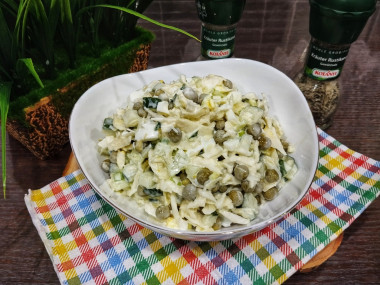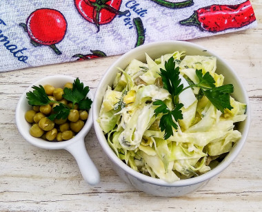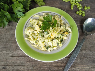 Этот вкусный и сочный салат очень хорошо подошел на ужин к жареной картошке и мясу. Порцию я удвоила, т.к. семья у нас большая. Вместо майонеза заправила соусом, состоящим из сметаны, лимонного сока, сахара и соли. Молодая капуста в салате очень вкусна, богата витаминами, а так же создает объем. Вообще все ингредиенты хорошо сочетаются друг с другом. Благодаря зеленому горошку и яйцам, салат получился достаточно сытным. Хрустящий, свежий и доступный по цене салатик! Обязательно приготовьте!