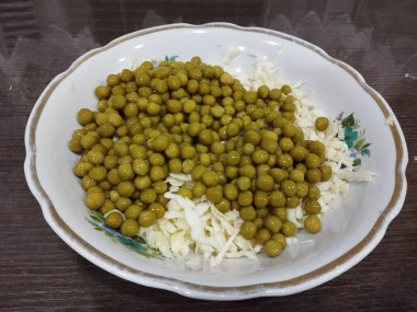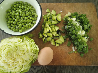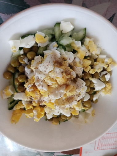 Искала на любимом сайте рецепт из доступных продуктов быстрого приготовления. Понравился салат с зелёным горошком яйцом и огурцом. Приготовила это блюдо на гарнир к котлетам. Домашние яйца сварила вкрутую, остудила, почистила и порезала. Огурцы тепличные порезала, измельчила капусту, покрошила зелёный лук и петрушку вместо укропа. В конце добавила молодой свежий зелёный горошек вместо консервированного. Заправила салат майонезом и поперчила. Очень простое и лёгкое приготовление салата. Вкус замечательный. Все ингредиенты отлично сочетаются между собой. Салат и лёгкий, и свежий, и хрустящий, и сытный. Такой салат можно готовить хоть каждый день. В следующий раз попробую заправить салат сметаной и посолить. Хороший рецепт! Спасибо)