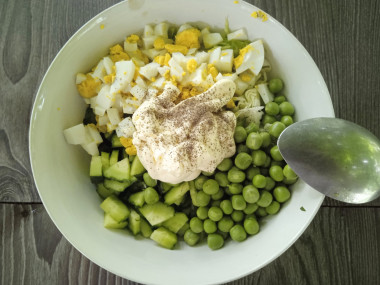 Охлажденные яйца очистите от скорлупы и нарежьте также кубиками. С консервированного горошка слейте жидкость. Нарезанные яйца и зеленый горошек добавьте в чашу к огурцам.