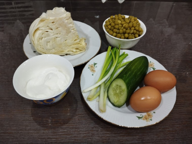 Заинтересовал рецепт салата с зеленым горошком яйцом и огурцом, решила приготовить на ужин. Пока отваривались яйца, порезала огурец кубиками, лук мелко порезала, капусту мелко нашинковала. Яйца остудила, также порезала кубиками. Соединила все ингредиенты, слегка посолила и вместо майонеза добавила сметану.