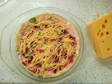 Колбасу можете использовать любую: вареную, копченую, полу-копченую или сосиски. Колбасу нарежьте тонкой соломкой или кубиками. Посыпьте пиццу нарезанной колбасой.