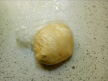 Замесите эластичное тесто, оно получается слегка липковатым по консистенции. Оберните его в пищевую пленку или пакет и уберите на полчаса в холодильник. Если у вас мало времени, то оставьте тесто на 5 минут при комнатной температуре. "Вылежавшееся" тесто намного удобнее в работе, оно мягче и эластичнее.