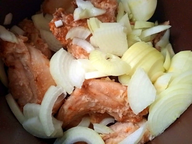 Лук очистите от шелухи и промойте. Затем нарежьте лук полукольцами и добавьте в сковороду к мясу. Обжаривайте все вместе 2-3 минуты. За это время лук станет прозрачного цвета.