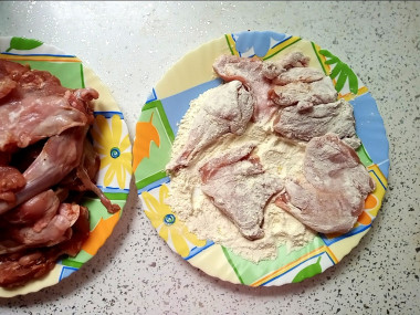 В небольшую тарелку насыпьте немного муки и обваляйте каждый кусочек крольчатины в муке со всех сторон. Следите, чтобы мука равномерно покрыла каждый кусочек.