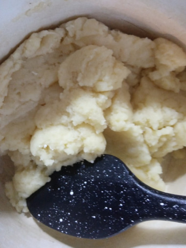 Тесто должно стать гладким, однородным и отходить от стенок кастрюли. Мешая, прогрейте тесто на медленном огне еще 1-2 минуты, чтобы мука хорошо заварилась. Снимите кастрюлю с плиты, дайте тесту немного остыть до теплого состояния.