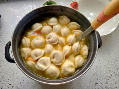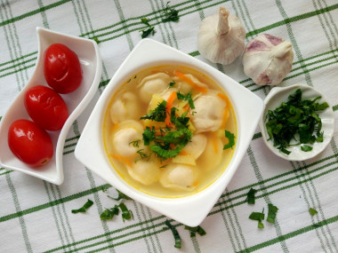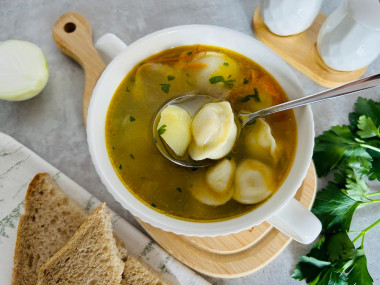 Тем более что этот суп готовится очень просто и быстро. Готовила по рецепту, так как пельмени у меня маленькие, варила их после всплытия 5 минут. В конце добавила мелко нарезанную петрушку. Такой суп - простой и вкусный вариант первого блюда. Пельмени придают особую сытность, а картофель добавляет густоту и насыщенность. Благодарю за рецепт.
