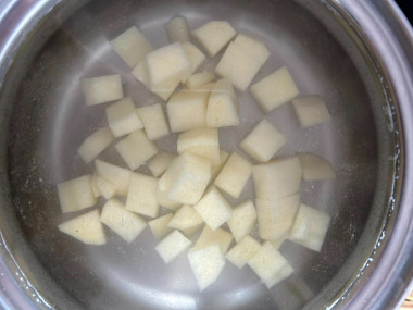 Налейте в кастрюлю холодную воду, добавьте немного соли и всыпьте картофель. Мы добавляем картошку в холодную воду, чтобы образовался картофельный отвар. И солим картошку в начале для того, чтобы кубики не разварились и оставались целыми. Поставьте кастрюлю на средний огонь, дождитесь закипания, снимите пену и варите картошку около 10 минут. Как выбрать кастрюлю для варки супа читайте в статье в конце рецепта.