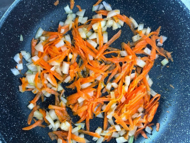 Добавьте к луку морковку и жарьте еще 5 минут периодически помешивая. Вы можете тушить овощи немного дольше, смотрите по их состоянию.