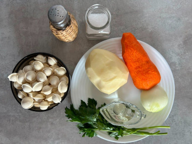 Калорийность продуктов: Вода, Картошка, Пельмени готовые, Морковь, Лук, Растительное масло, Сливочное масло, Зелень, Соль, Перец черный молотый