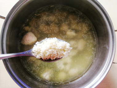Как только мясо было готово, удалила из кастрюли сделавшие свое дело лук и морковь. Затем добавила в суп  промытый рис, варила его 10 минут. В последнюю очередь положила зажарку, лавровый лист и соль, варила суп еще пару минут.