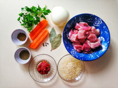 Калорийность продуктов: Филе говядины, Вода, Лук репчатый, Морковь, Грецкие орехи, Молотый кориандр, Хмели-сунели, Ткемали Соус, Аджика, Томатная паста, Зелень, Перец горошком, Лавровый лист, Растительное масло, Рис, Соль