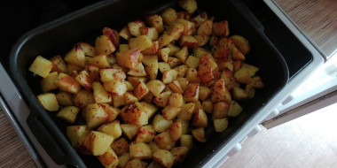 Готовые кусочки картошки должны быть покрыты красивой золотистой корочкой. Внутри запеченная картошка по-деревенски должна быть мягкой.