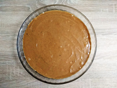Форму смажьте растительным маслом. Вылейте тесто в форму, поверхность разровняйте лопаткой. Я взяла разъемную, диаметром 20 см.