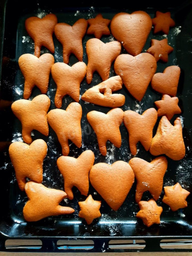 Делала ребёнку на первый зубик. Художник из меня так себе, но выпечка очень вкусная. В следующий раз, правда, имбиря поменьше добавлю, очень прям сильный аромат, на любителя. А так идеальный рецепт, мягкие, вкусные пряники!
