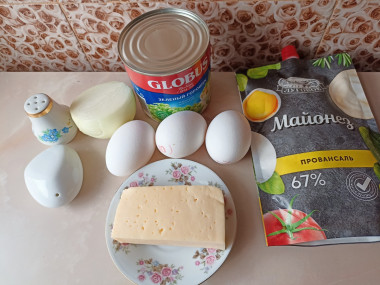 Как сделать салат Чайка с сыром и горошком? Для начала подготовьте все необходимые ингредиенты по списку. Консервированный горошек можно заменить на отварной зеленый горошек, а майонез на сметану.