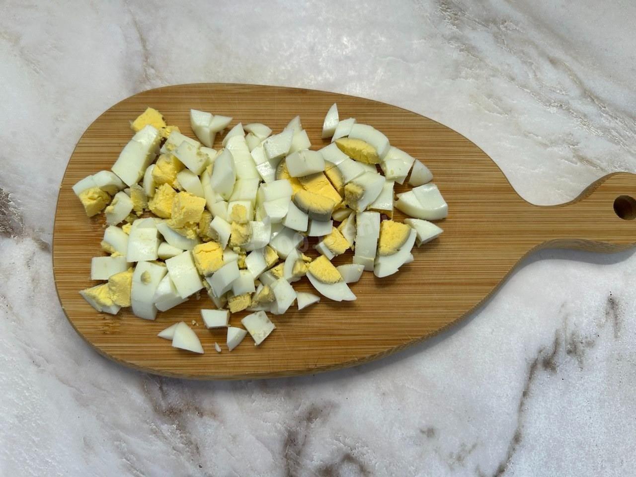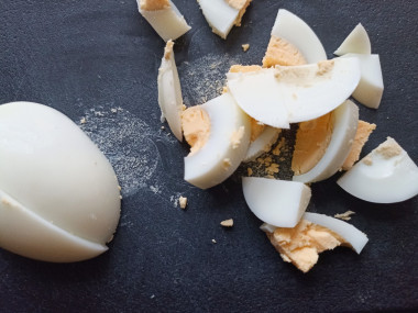 Нарежьте яйца кубиками или натрите на крупной терке.