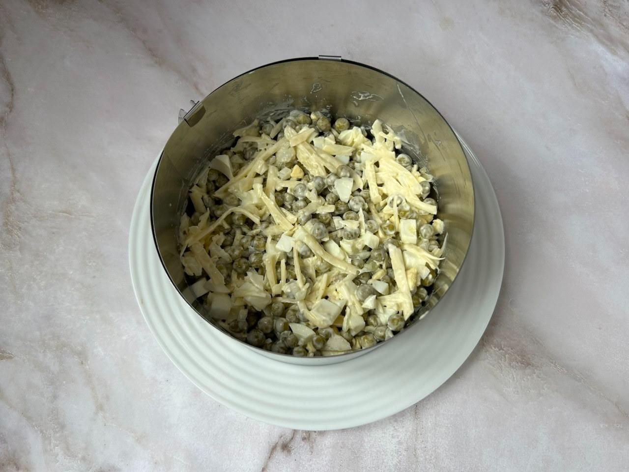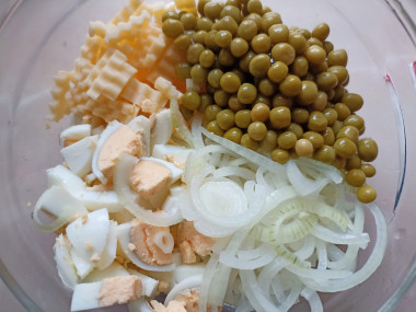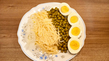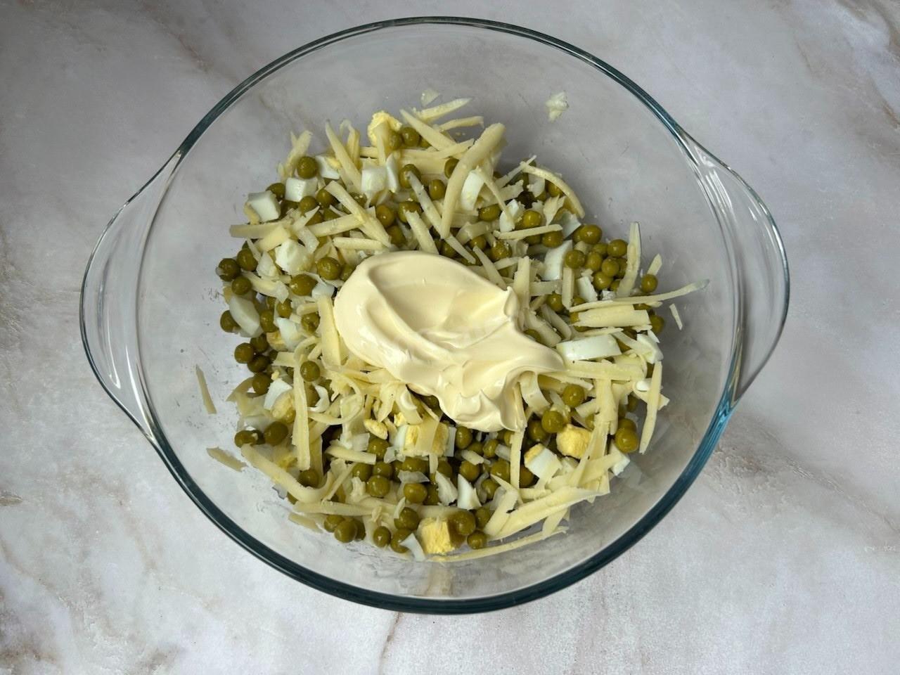 Смешайте яйца, зеленый горошек, натертый сыр и нарезанный лук. Добавьте майонез, соль и при желании черный перец. Все хорошо перемешайте. Майонез можно сделать самостоятельно. Рецепты домашнего майонеза вы найдёте после последнего шага.