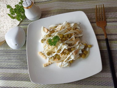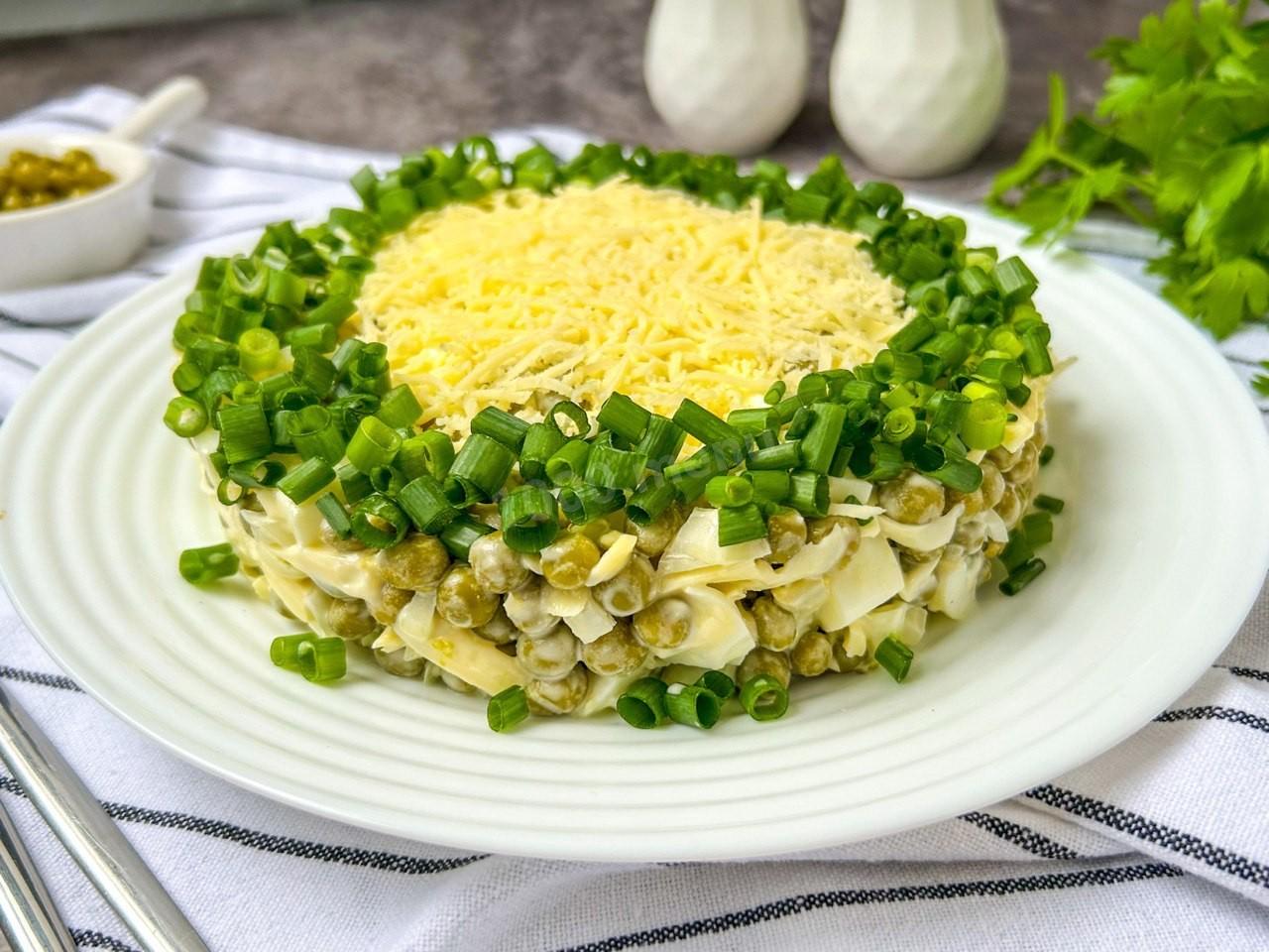 Вместо консервированного горошка подойдёт отварной зелёный горошек.