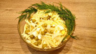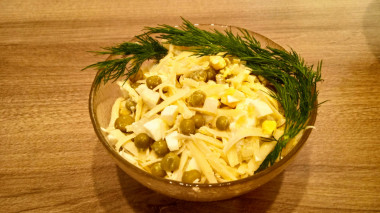 Приготовила салат Чайка классический с сыром. Отварные яйца в холодильнике были,сыр и баночка зелёного горошка тоже нашлись. Лук нарезала полукольцами. С горошка слила сок, сыр нарезала фигурным ножом, нарезала яйца. Смешала все ингредиенты, добавила по вкусу черный молотый перец и заправила майонезом. Салат получился сытный, вкусный, с пикантным привкусом лука. Спасибо автору за рецепт!
