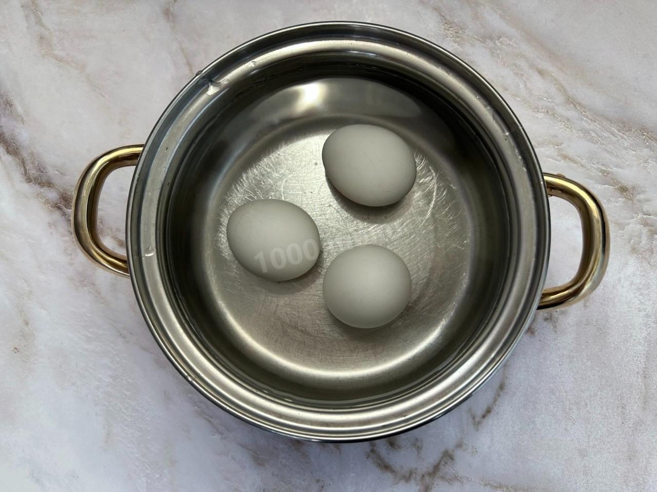 Яйца хорошо промойте под проточной водой со специальным средством, отварите вкрутую, охладите и очистите. О том, как выбрать кастрюлю для варки читайте в статье, ссылка под рецептом.