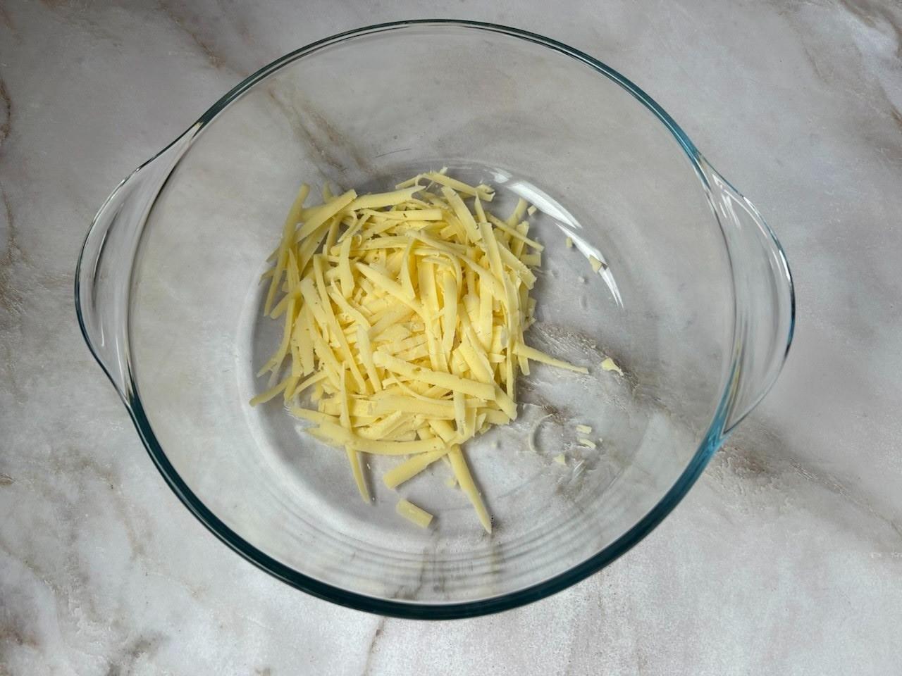 Порежьте кубиками или натрите на крупной терке сыр. Твердый сыр также можно заменить на плавленый, сулугуни или любой другой, который вам больше всего нравиться. О вариантах замены сыров читайте в статье, ссылка под рецептом.