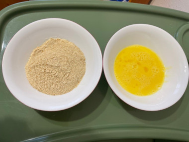 Отдельно подготовьте две чаши. В одну из них насыпьте панировочные сухари, а в другую разбейте сырые яйца и немного взболтайте их с помощью венчика или вилки.