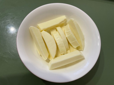 Как пожарить сулугуни на сковороде в панировке? Подготовьте продукты по списку. Яйца вымойте и обсушите бумажными салфетками. Сыр сулугуни нарежьте на небольшие брусочки, примерно одного размера.