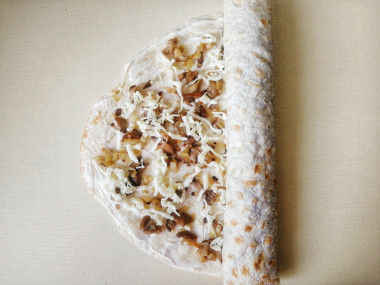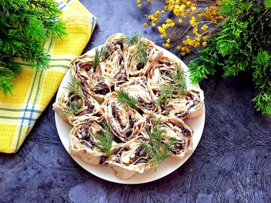 На праздник сделала лаваш с грибами и плавленым сыром. Этот вариант закуски особенно понравился взрослым.