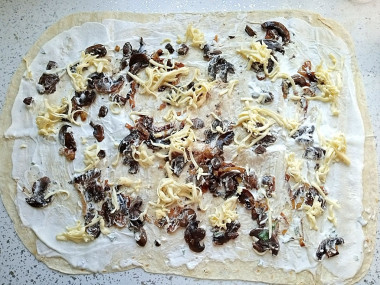 Выложите поверх первого листа второй лист, также смажьте его равномерно майонезом. Выложите на него обжаренные шампиньоны с луком, равномерно распределяя по всей поверхности.