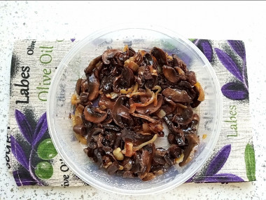 Лук очистите от шелухи и нарежьте произвольно. Шампиньоны переберите от земли и мусора, промойте под холодной проточной водой. Нарежьте не очень крупно грибы. Сковороду разогрейте на среднем огне, налейте в неё растительное масло, равномерно распределив его по дну сковороды. Выложите нарезанные шампиньоны и лук и обжарьте их до готовности, постоянно помешивая, на среднем огне. В конце обжаривания немного присолите. Готовые грибы с луком остудите.