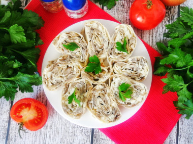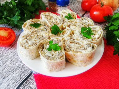 Использовала для рулета всего один лист лаваша, чтобы он вышел мягким и нежным на вкус. Смазала лаваш майонезом, добавила обжаренные вешенки с луком. Поверх грибов натерла на крупной терке плавленный сырок. Свернула лаваш рулетом, положила в целлофановый пакет и убрала в холодильник на 2 часа. Перед подачей нарезала на кусочки шириной 1,5 см.