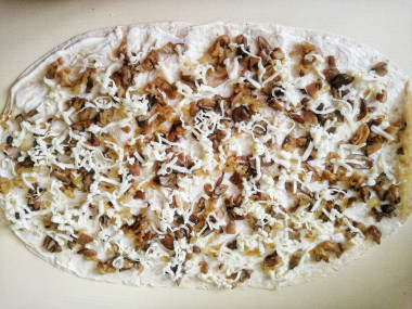 Грибы с луком жарила с вечера, а утром закрутила в рулет. Для начинки выбрала шампиньоны. Они были замороженные, поэтому сначала дождалась пока растопится лед, потом добавила растительное масло и лук. Обжарила до золотистого цвета и очень аппетитного аромата). Вместо майонеза смазала лист лаваша отвешеной сметаной, поперчила и выложила грибы. Сверху потерла мягкий вкусный сырок. Я постаралась покрепче свернуть рулет, ну, насколько это возможно). По крайней мере начинка не выпадала. В общем-то можно грибную начинку пропустить через мясорубку, тогда рулет свернется плотнее. Но мне понравились именно фактурные грибы.