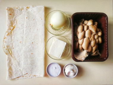 Как сделать лаваш с грибами и плавленым сыром? Подготовьте продукты по списку. Из грибов у меня шампиньоны, но вы можете взять любые другие. Плюс грибы у вас могут быть как свежие, так и замороженные. Кроме того, подойдут и консервированные. Лаваша нужно два листа, сделайте их одинаковыми, обрезав краешки. Плавленый сыр любой, уберите его в морозилку, чтобы он легче натирался.