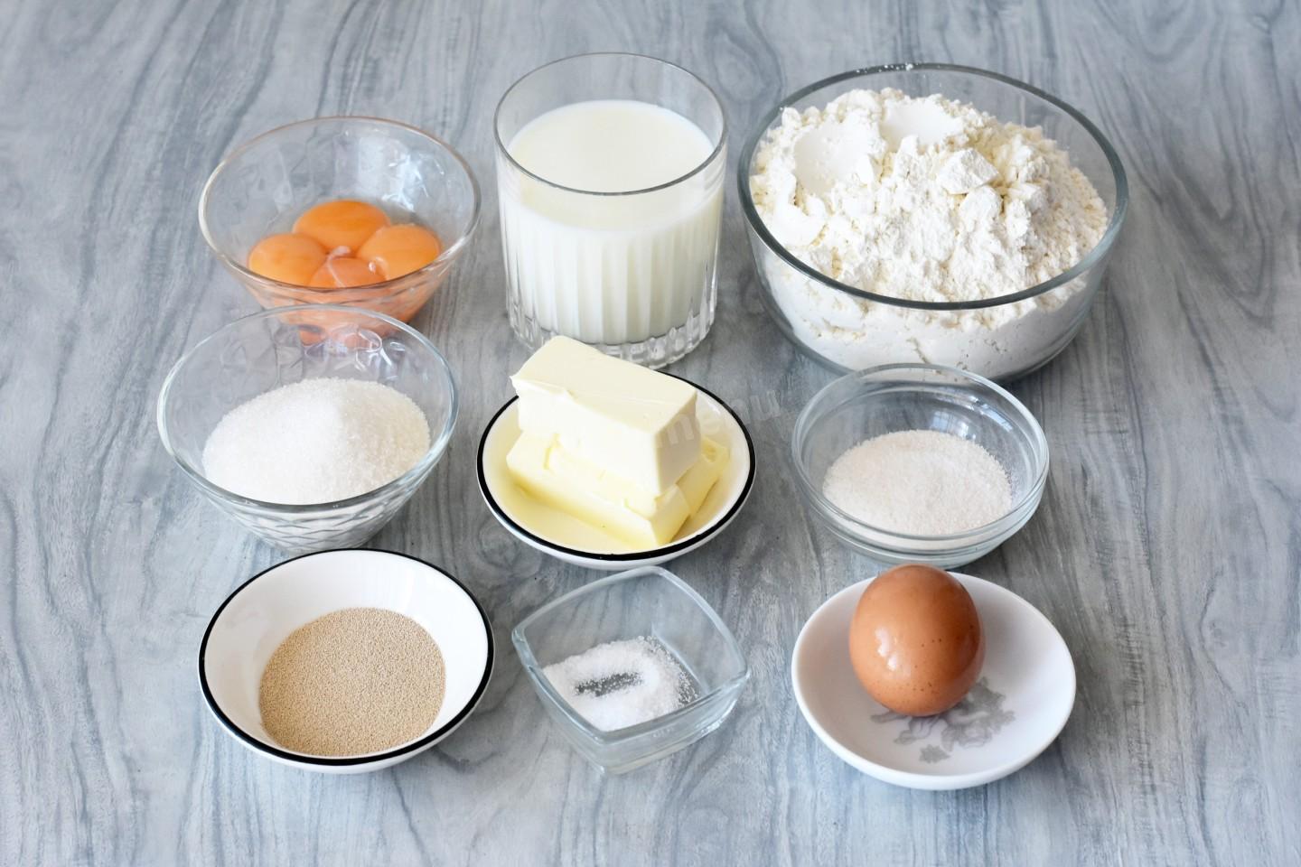 Для начала подготовьте необходимые ингредиенты по списку. Муку используйте высшего сорта. Сливочное масло и яйца должно быть комнатной температуры, поэтому заранее достаньте их из холодильника. Перед покупкой дрожжей почитайте инструкцию. В этом рецепте используются дрожжи, которые разводятся жидкостью. О видах дрожжей и способах их замены читайте в статье под шагам